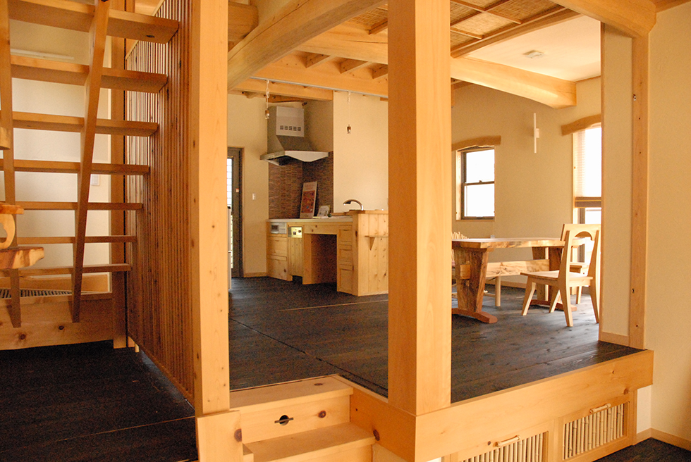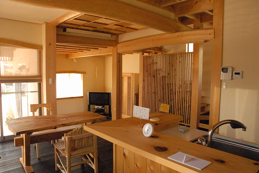 スキップフロアが広がりのある空間を演出します。柱は総檜、七寸の檜の柱と檜の梁組みが見事です。