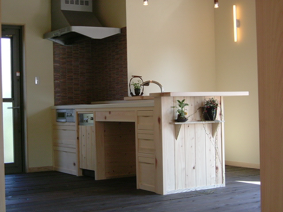 贅沢な木曽檜の手作りキッチン。IHクッキングヒーター仕様。バックパネルは煉瓦調タイルでお洒落です。 ワークトップ下はオープンスペース。ごみ箱や米びつなどの置き場として使えます。