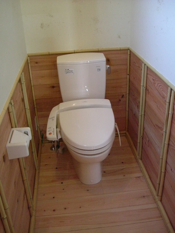 トイレは温かみが感じられる杉の腰板や手作りの陶器の手洗いを使用。便器は自動開閉付で便利です。